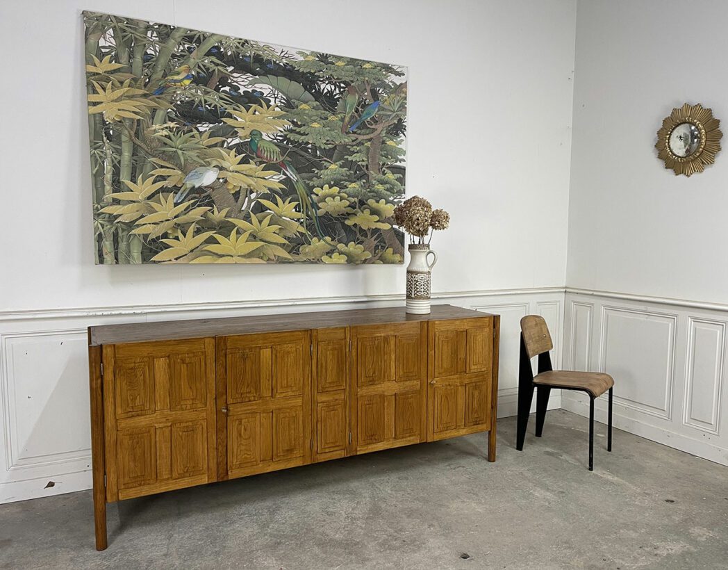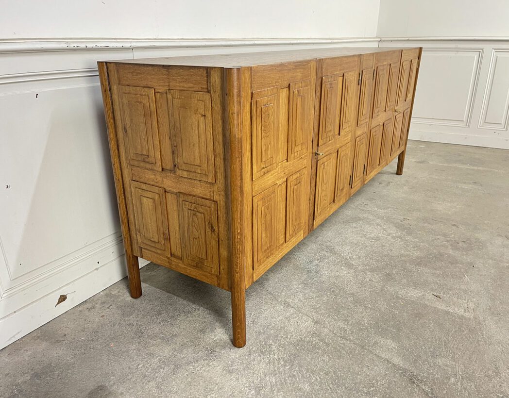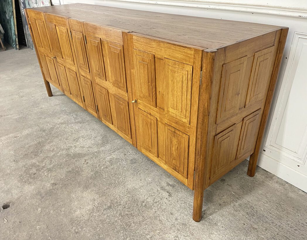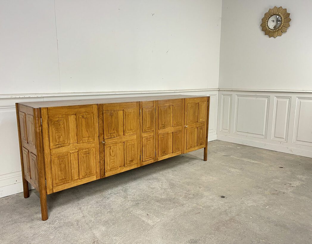 Ce vaste buffet scandinave aux allures d’enfilade est composé de chêne massif. En parfait état, restauré et vernis dans notre atelier, il date des années 1950.