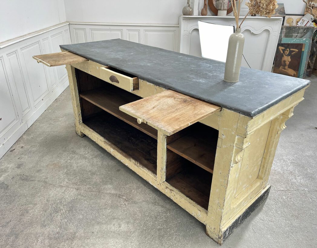 Doté de nombreux rangements et de deux planchettes rétractables, ce beau comptoir vintage en chêne et feuille de zinc présente des moulures élégantes et une patine lumineuse.