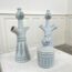 Bel ensemble composé d’un huilier (veuillez noter une légère fêlure partant de la base, visible sur les photos), d’un vinaigrier ainsi que d’un moutardier, réalisé dans les Ateliers de Vallauris. Création des années 1950 ou 1960, cet ensemble de table présente des teintes douces dans les tons gris-bleu et un motif rappelant certaines céramiques des îles Cyclades.