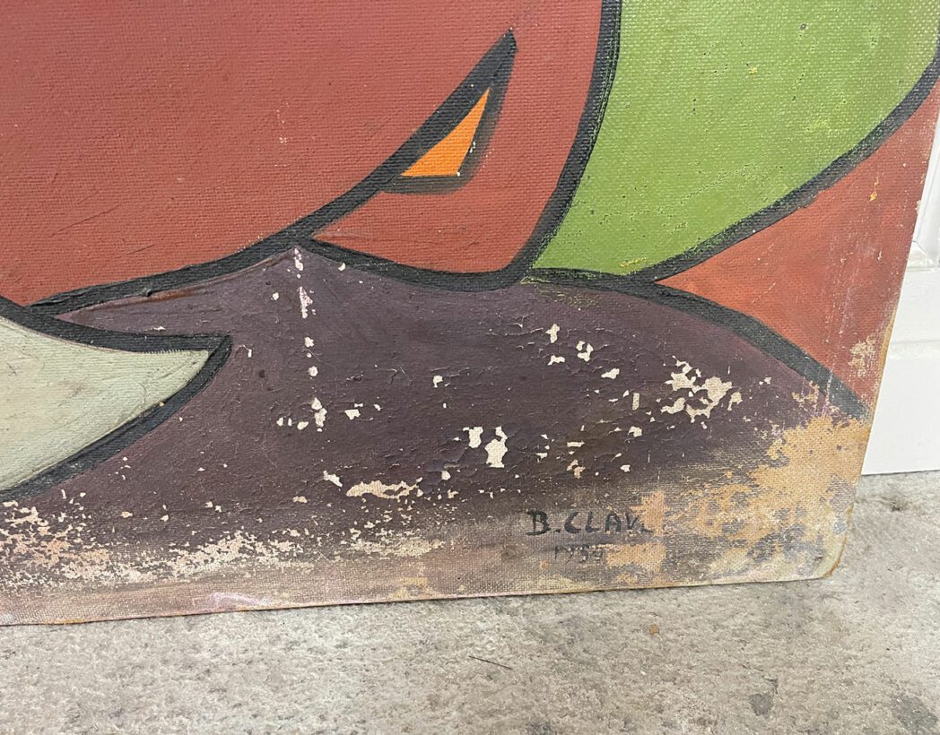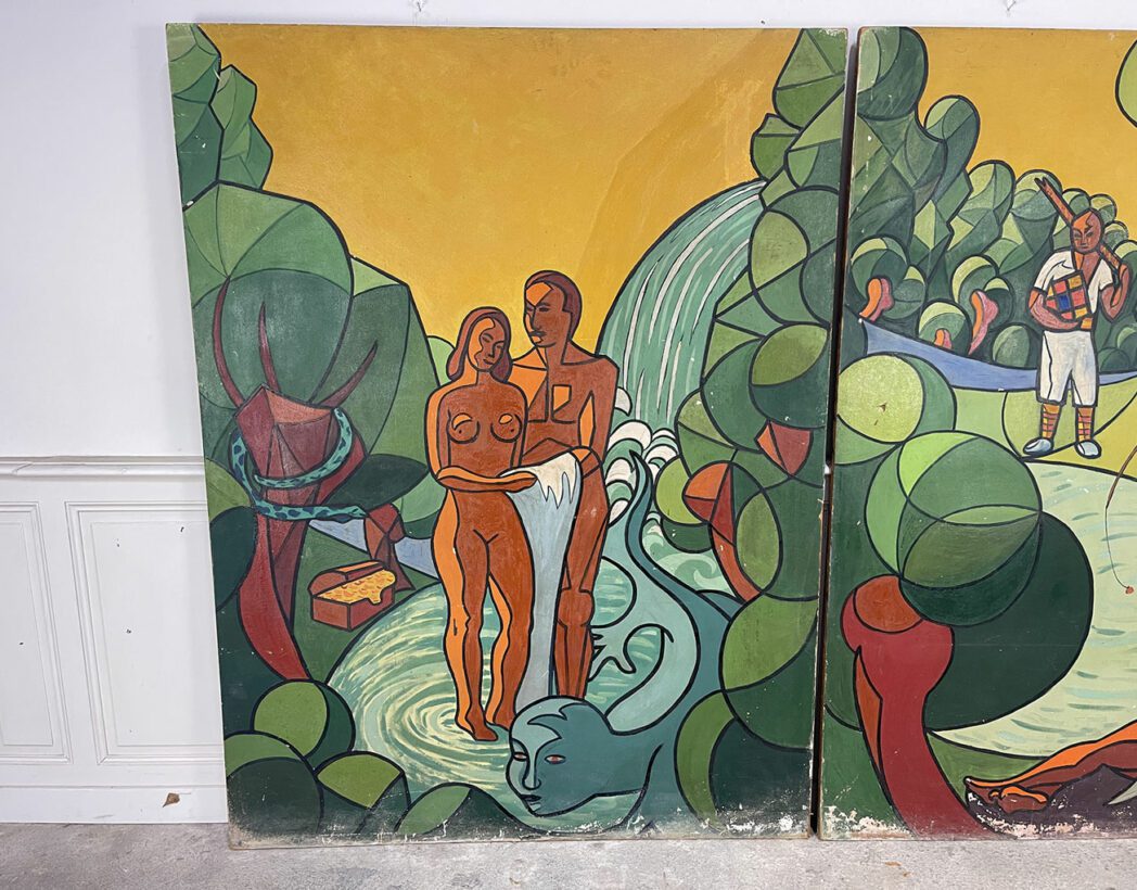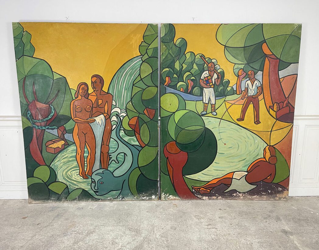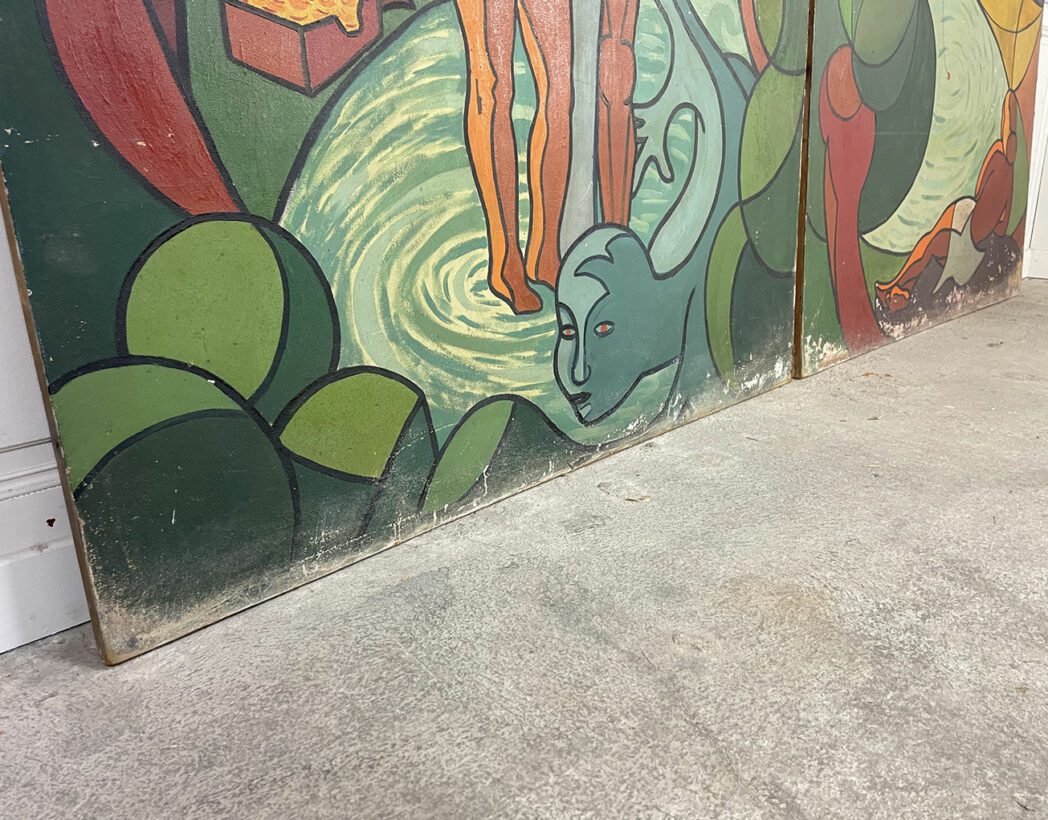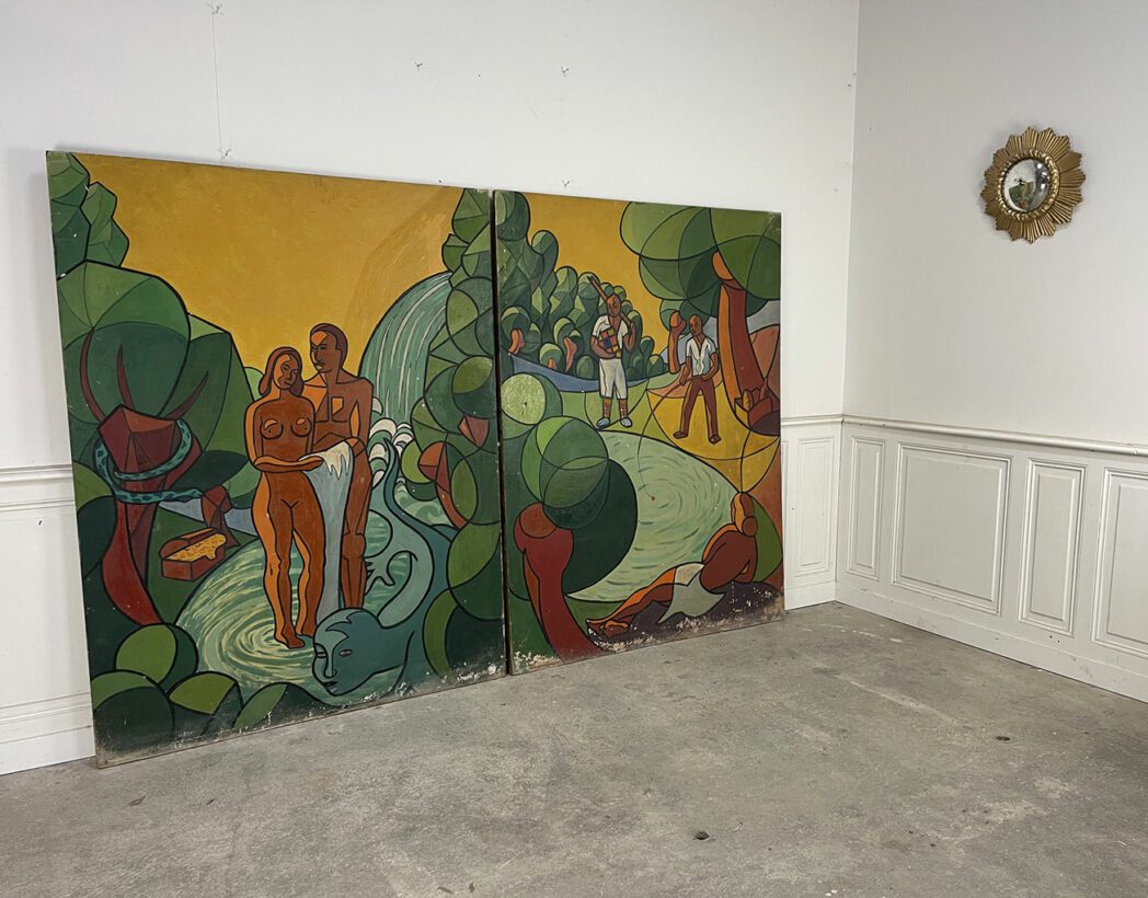 Vaste diptyque provenant d’une villa du sud de la France, signé partiellement (les lettres sont effacées, on distingue B.CLAV…) et daté de 1959.