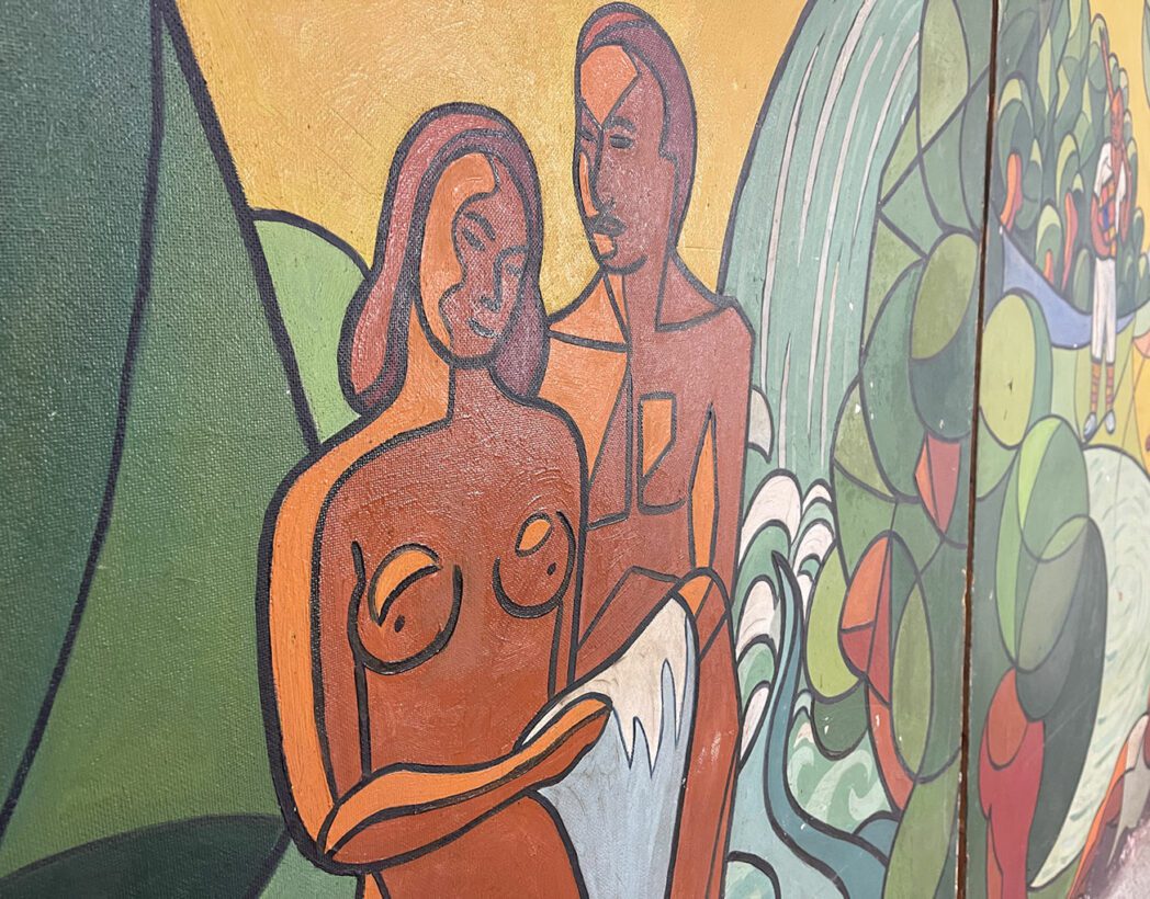 D’un côté les loisirs liés à l’eau, de l’autre une évocation du Jardin d’Eden avec Adam & Eve enlacés : la composition, vivante, aborde des thèmes liés au plaisir de vivre.