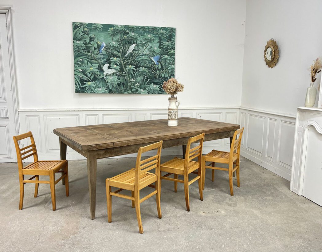 Cet ensemble (non empilable) a été entièrement nettoyé et restauré dans nos ateliers. Les chaises présentent un bon état général (voir photos) et une jolie patine aux tons miel doré.