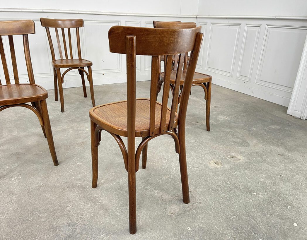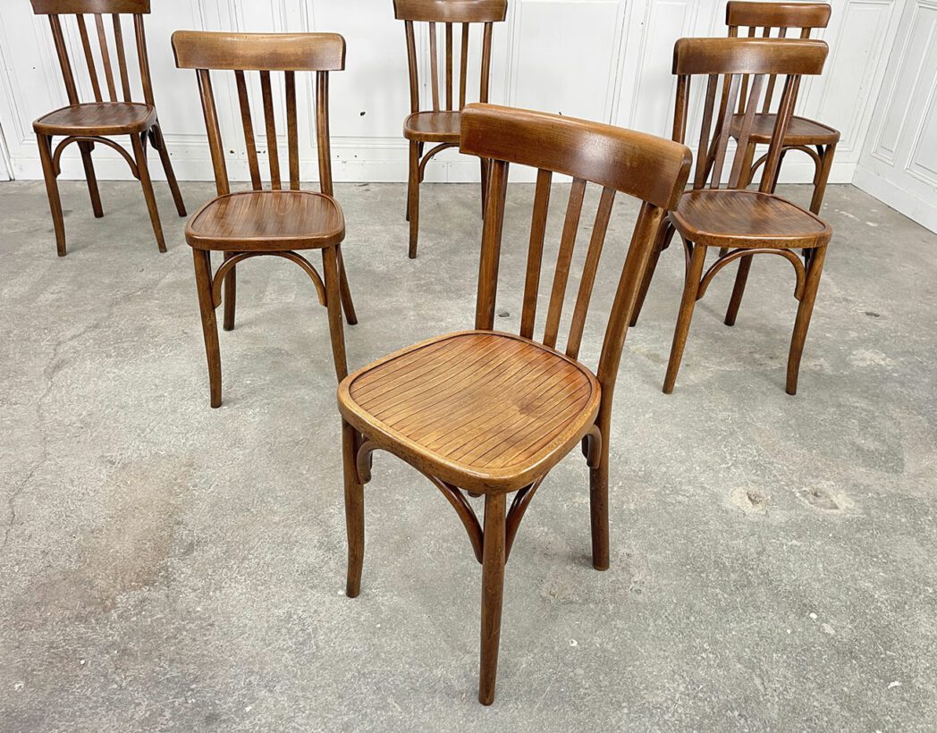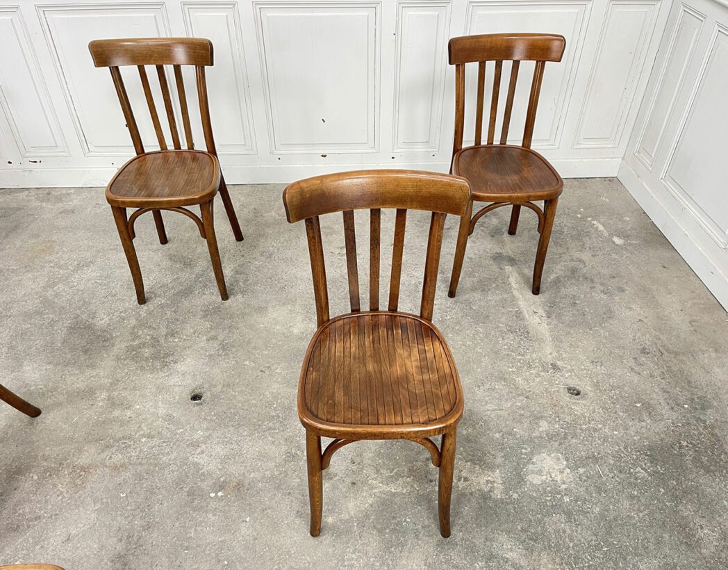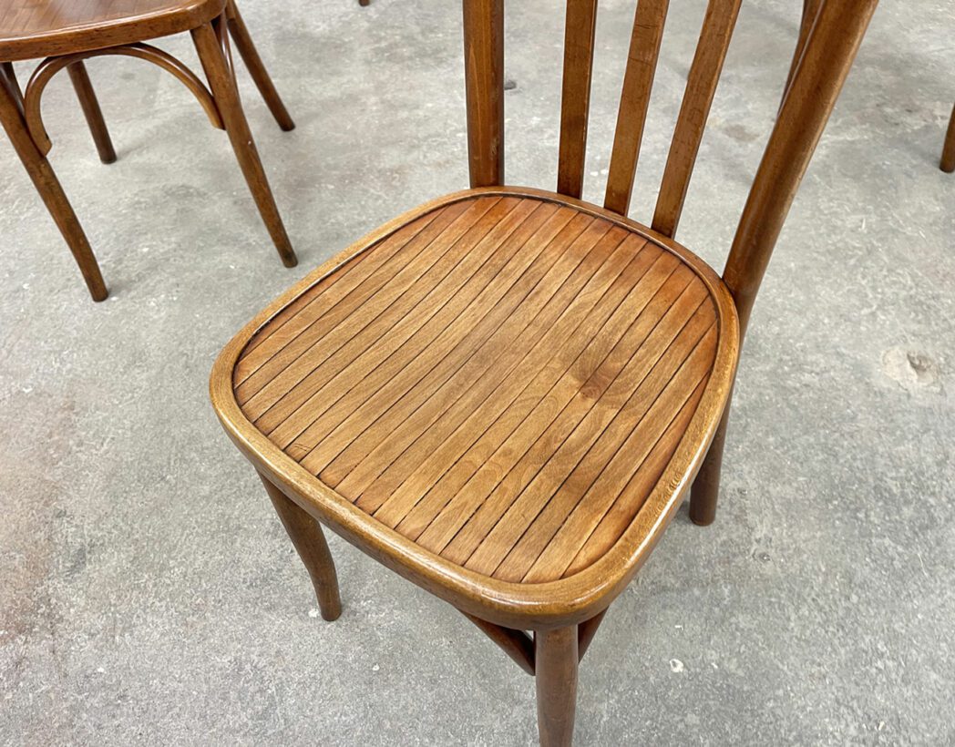 Conçues dans les années 1930 en bois de hêtre, ces chaises bistrot authentiques, de la marque FISCHEL, ont été entièrement nettoyées, restaurées et vernies à l’incolore mat dans notre atelier.