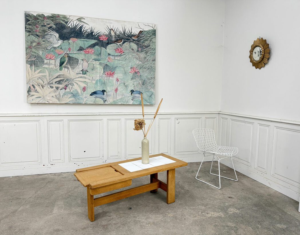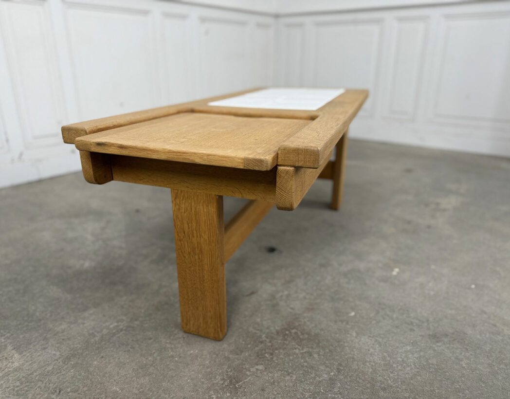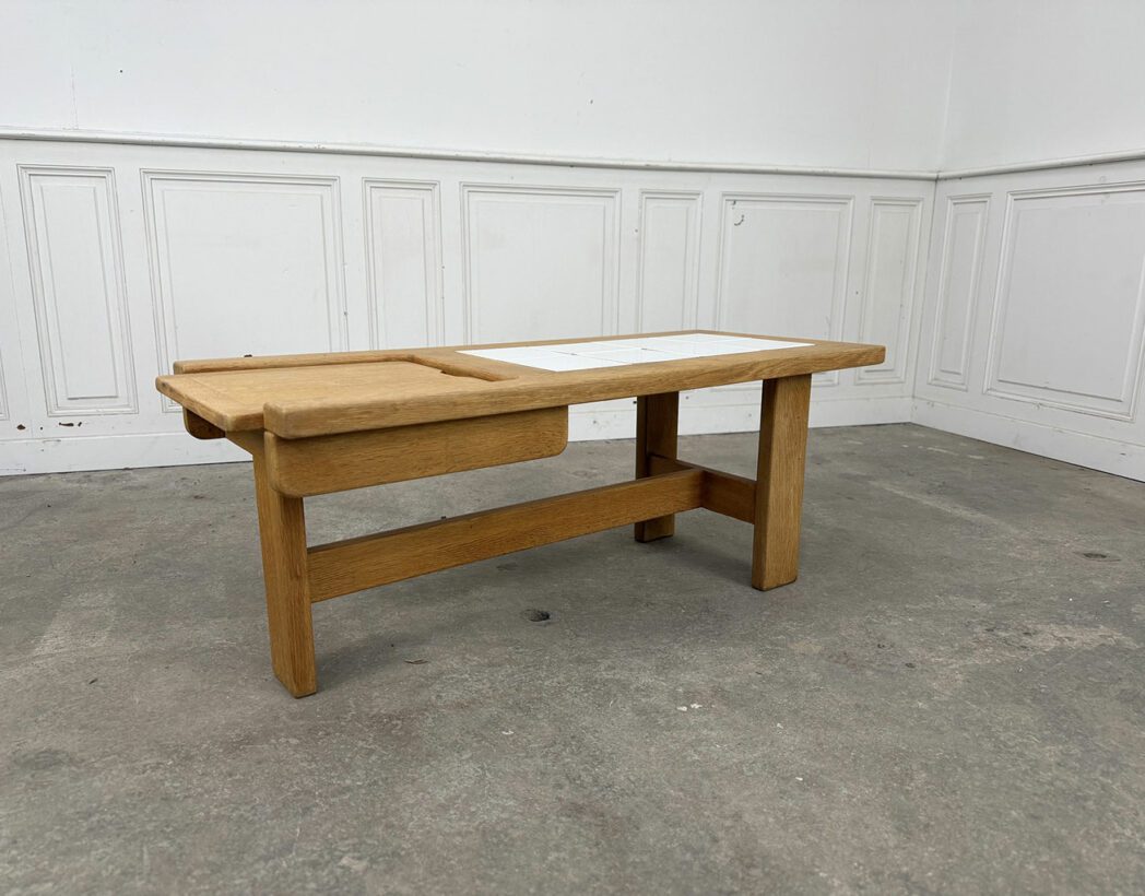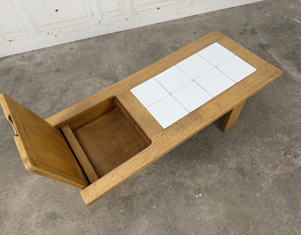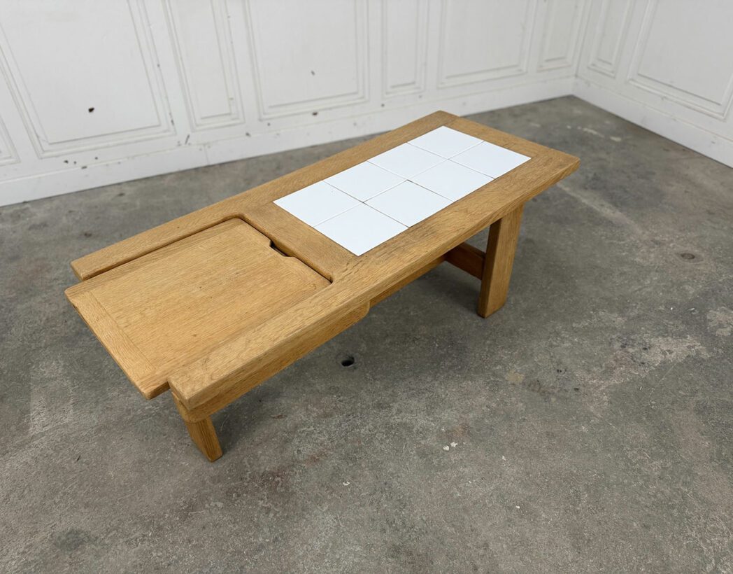 Dessinée et conçue dans les années 1960 par le duo de designers Robert Guillerme & Jacques Chambron, cette table basse vintage présente un plateau en chêne et en carreaux blancs de céramique, abritant une trappe secrète !