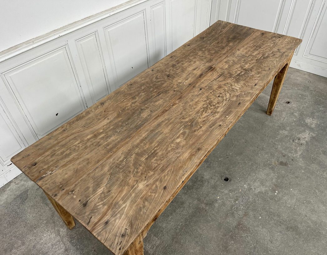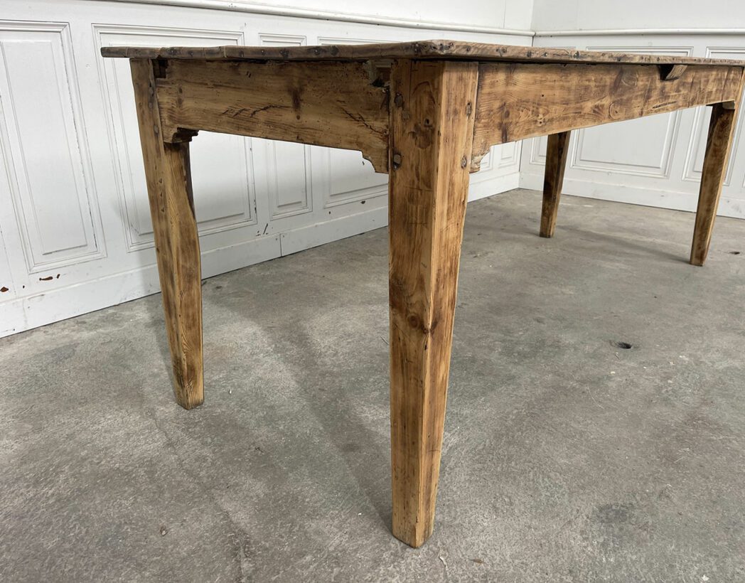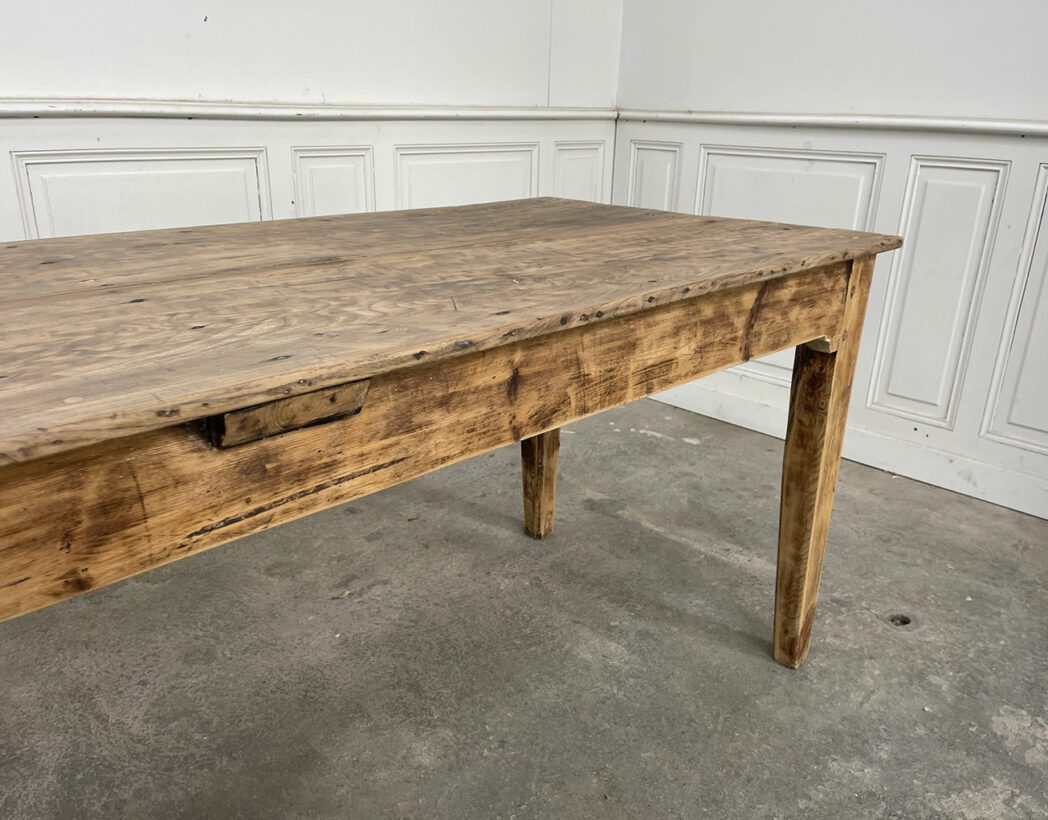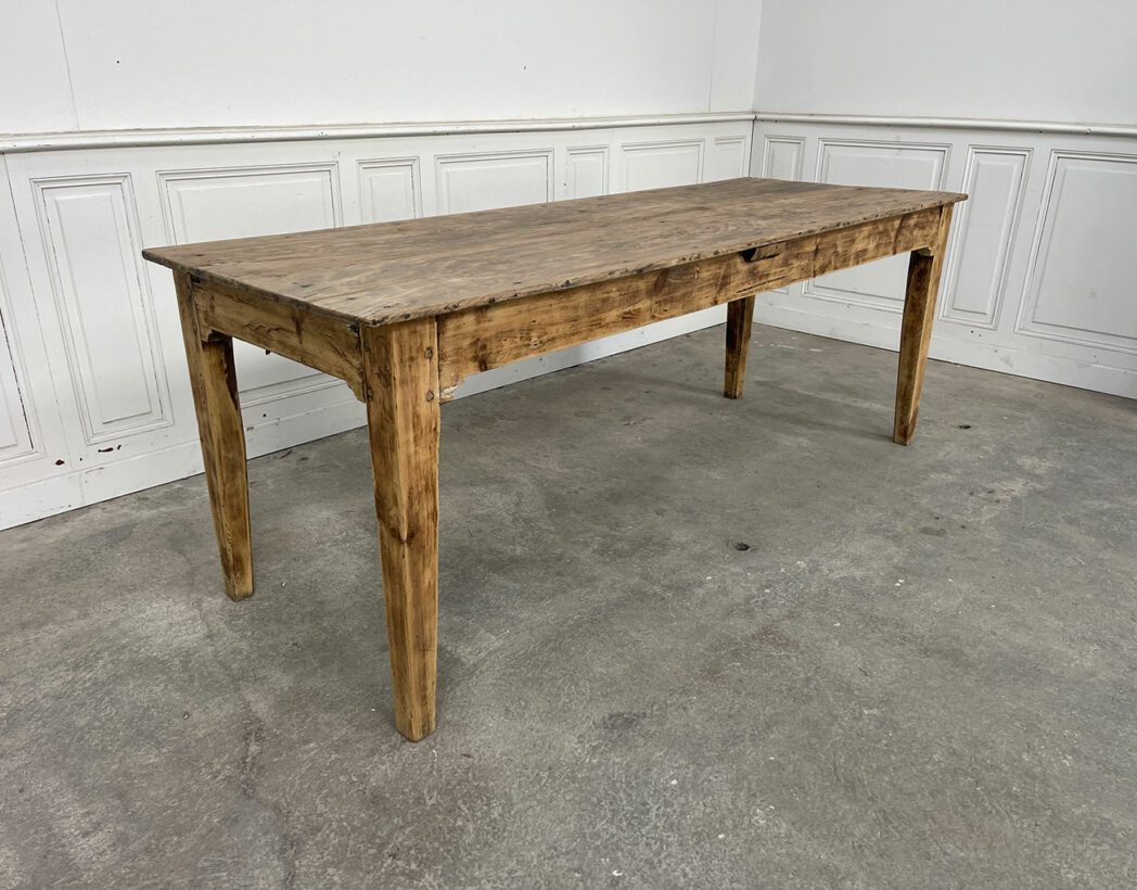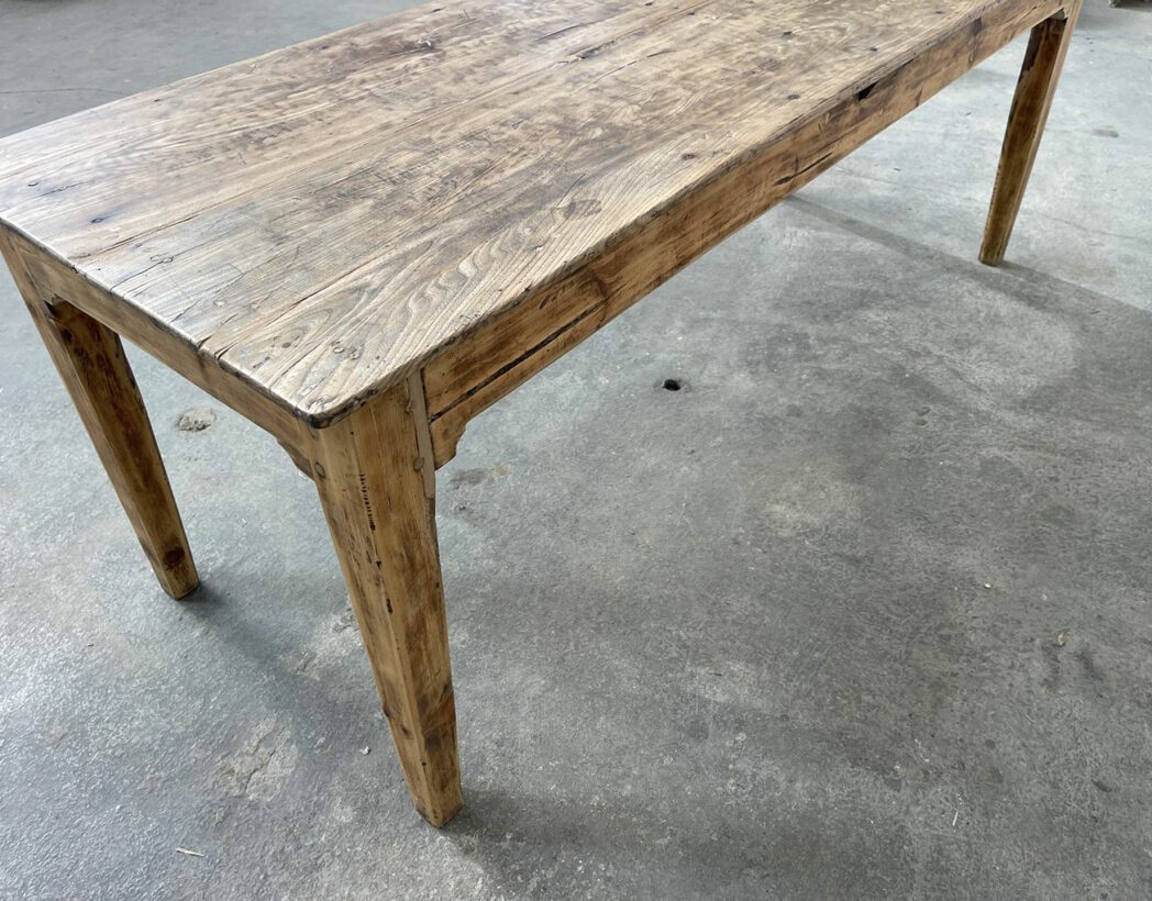Fabriquée dans les années 1930, cette ancienne table de ferme présente un plateau en chêne et une structure en sapin.